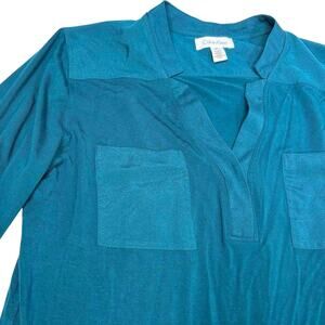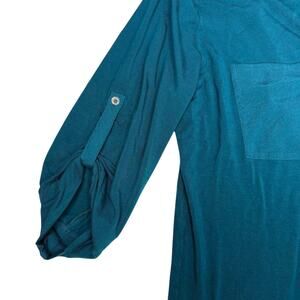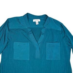 Calvin Klein Women’s Blouse Medium Teal Green 3/4 Roll Tab Sleeve V-Neck