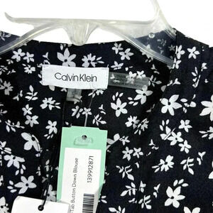 Stylish Calvin Klein black and white floral blouse, button down design, brand new with original tags attached, perfect for a chic and elegant look. Ideal for casual or work wear.