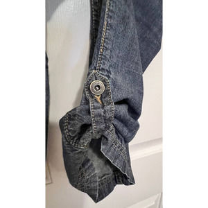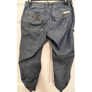 Calvin Klein Women's Capri Jeans wear two ways buttoned on the sides or straight down Size 4 14" waist x 8 1/2" rise x 14" buttoned up on the side and 21 1/2" total inseam x 8" leg opening. Light Weight