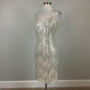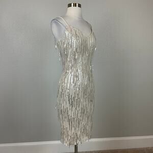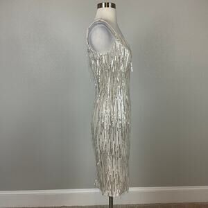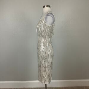 Calvin Klein Women's Cocktail Dress Size 4 Silver Sequined Fringe Midi Sheath