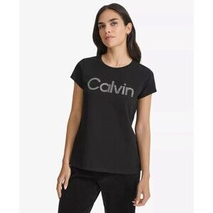 Calvin Klein Women's Crystal-Logo Crewneck T-Shirt Casual Chic Black XS