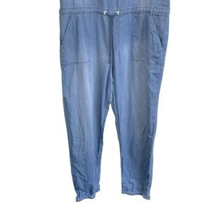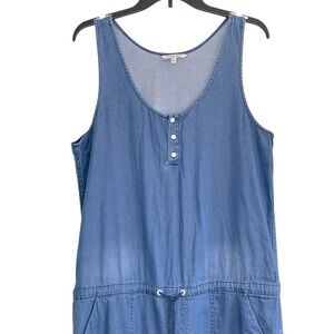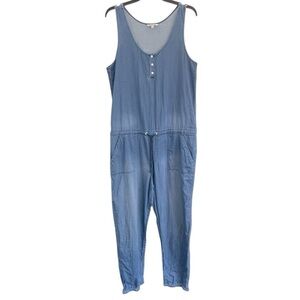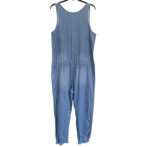 A light blue, sleeveless jumpsuit with a button-down front and a drawstring waist, likely made of denim or chambray material. The style is casual and relaxed, suitable for everyday wear.