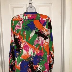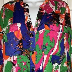 Preowned in good condition. No stains or tears. There is a pull on the right arm ( see picture) no really noticeable with all the colors. This is a bright and colorful blouse. Please see pictures for measurements.