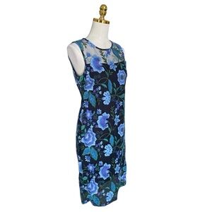 This Calvin Klein dress is a stunning sheath design in a captivating blue hue, perfect for wedding guests or cocktail events. The sleeveless, crew neckline adds a touch of elegance, while the midi length offers a sophisticated silhouette. Its artistic floral pattern enhances the modern appeal, making it a standout choice for any special occasion.