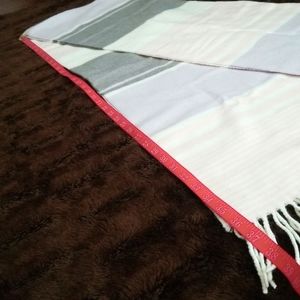 Calvin Klein Women's Fringed Oversized Wrap/Scarf with Stripes - One Size. Beautiful, soft pink, white, grey, lavender, 100% Acrylic. Please see photos for measurements.