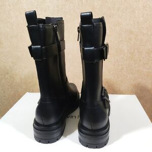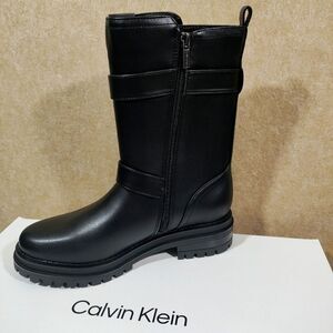 Elevate your fashion game with these brand new with box Calvin Klein Women's Galivan booties. These mid-calf booties feature an almond toe shape and a sleek black color that will complement any outfit. The synthetic lining and rubber outsole provide comfort and durability, while the lug heel style adds a touch of edginess. These Calvin Klein Galivan booties are perfect for any woman who wants to make a statement with their footwear. The faux leather upper material and 1.77 inch heel height provide the perfect combination of style and comfort. Whether you're dressing up for a night out or running errands, these booties are a versatile addition to any wardrobe.