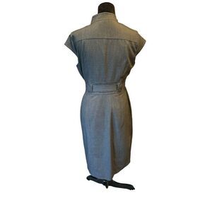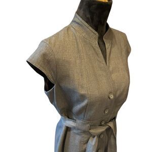 Keywords: Calvin Klein, women's dress, size S, gray dress, midi dress, button front, tie waist, cap sleeve, V-neck, polyester blend, pre-owned dress, dry clean only, stylish dress, elegant dress, regular size dress