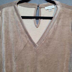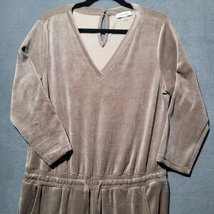 Keywords: Calvin Klein, jumpsuit, velour, drawstring, waist, pockets, v neck, womens, lounge, casual, comfortable, beige jumpsuit, brown jumpsuit