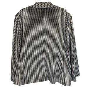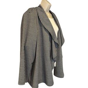 Chic and timeless Calvin Klein black and white houndstooth blazer jacket, designed with a draped open front and soft stretch fabric for effortless sophistication. Fully lined for comfort, this piece transitions easily from work to weekend.