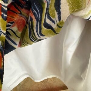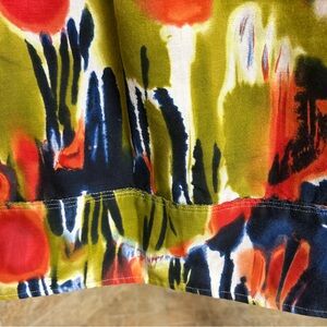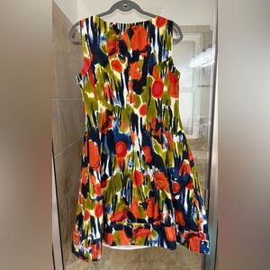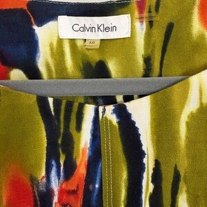 This is a Calvin Klein sleeveless fit-and-flare dress in a multicolor linen blend with an abstract
