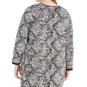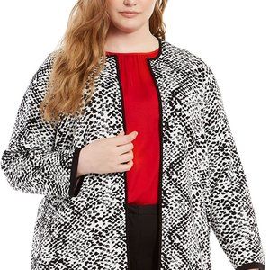 Top off pants and blouse with personality. This plus-size collarless cardigan by Calvin Klein flatters with a neutral animal print and clean, tailored shape.