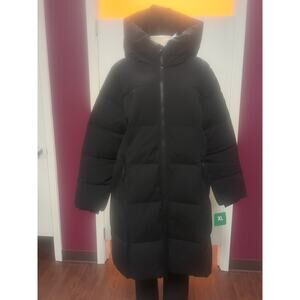 This is a Calvin Klein women's long parka coat in size XL, featuring a black polyester outer shell with down insulation. The coat has a zip closure, polyester lining, and is machine washable. It is designed for casual wear and has a stylish outdoor theme. The brand is Calvin Klein, and the coat is made in China.
