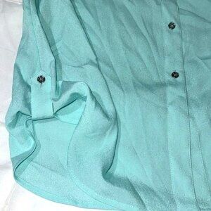 This Calvin Klein blouse is designed with comfort and style in mind. Its soothing aqua color and unique zippered chest pockets make it a standout piece in any wardrobe.