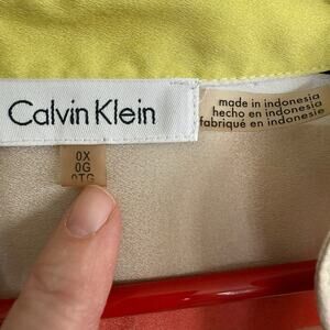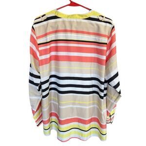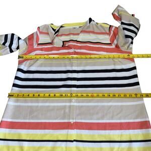 The Calvin Klein Women's Long Sleeve Lightweight Casual Button Up Striped Blouse in size L is a versatile and stylish top suitable for various occasions such as travel, casual outings, and business meetings. Made of lightweight polyester material, this blouse features a V-neckline, long sleeves, and button closures for a comfortable and classic look. The multicolor striped pattern adds a pop of style, making it a great addition to your wardrobe for the summer, fall, and spring seasons. Calvin Klein's iconic brand and quality construction ensure a timeless and flattering fit for plus size women.