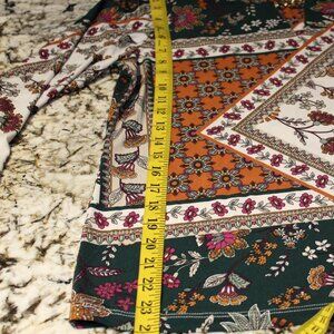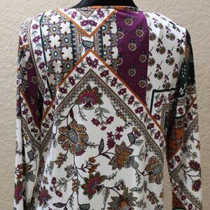Add a vibrant touch to your wardrobe with this stylish Calvin Klein knit top in size Medium. This eye-catching blouse features a beautiful and intricate multi-color print in shades of green, orange, white, and purple, with a globally-inspired or bohemian pattern. The neckline has a unique keyhole opening accented by a gold-toned chain-like embellishment, adding a touch of sophistication. With comfortable 3/4 sleeves and a soft knit fabric, this top is perfect for dressing up or down for various occasions.