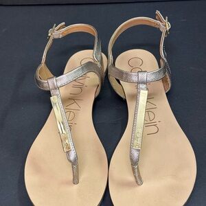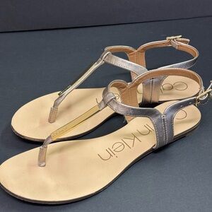Step out in style with these Calvin Klein metallic sandals. Perfect for any occasion, these sandals offer both comfort and elegance. The sleek design and metallic finish make them a versatile addition to your wardrobe. Sz 6.5