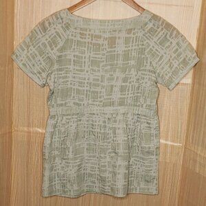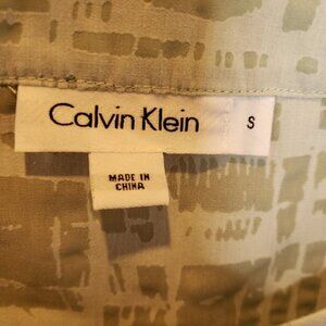 This gorgeous Calvin Klein short sleeve blouse has fabric covered buttons, a band at the waist, and a band at the sleeves. It is light and flowy. Measurements are 26" from shoulder to hem and 18" from armpit to armpit.