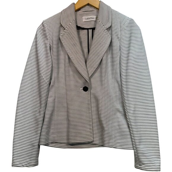 Calvin Klein Womens One Button Knit Blazer Jacket Sz 6 White Black Stripe