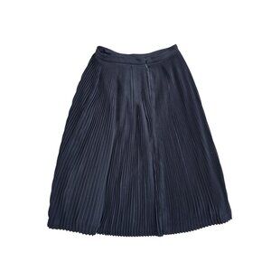 Calvin Klein Women's navy pleated A-line skirt in Size 2. Crafted from lightweight polyester with a zip closure for easy wear. Features a classic knee-length cut and fine pleated texture, offering both structure and flow. In good pre-owned condition.