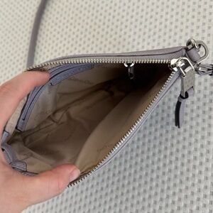 This crossbody shoulder bag has a beautiful light lavender solid color with an accent of silver for the Calvin Klein logo. The crossbody bag has a shoulder strap in lavender with an accent of a small silver link chain. The bag closure has a zipper and a small zipper pocket on the inside. This bag is great for when you need something small but chic and can be dressed up or down.