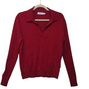 Calvin Klein Women's Scarlet Red Merino Wool Blend LS Open Neckline Polo Sweater
