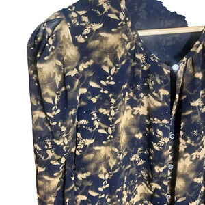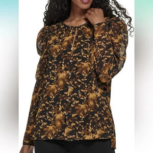Elevate your business wardrobe with this stylish Calvin Klein Poof Shoulder V-Neck Blouse. The black and gold floral pattern adds a touch of sophistication to this versatile blouse. The long sleeves and V-neckline make it suitable for both formal and casual occasions.