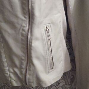 Calvin Klein buttery soft faux leather zip up jacket, zip pockets, zip up sleeves, cotton poly combo ribbing on sides and inside of sleeves for comfort, stand up collar, 100% polyurethane beautiful jacket excellent condition 18 in pit to pit