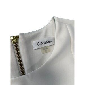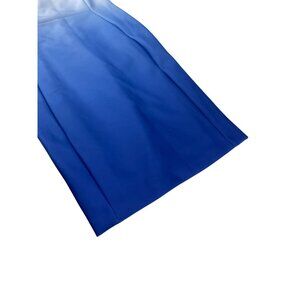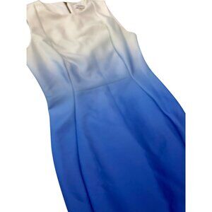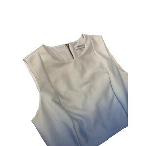 This Calvin Klein dress presents a sophisticated ombre design transitioning from white to blue. Its sheath silhouette enhances a polished look suitable for professional settings, meetings, or conferences. Total Length 39.5", Shoulders 13.5", pits 17", waist 14.5", hips 17", hem 17". No defects noted. SKU 9197