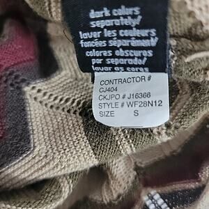 Calvin Klein women’s short sleeve sweater in size Small. Features a multicolor chevron pattern in earthy tones of beige, olive green, burgundy, and tan with a textured knit design. V-neck style, lightweight and stretchy fabric. Distinct Y2K vibe with bold chevron stripes and semi-sheer knit. Perfect for layering or wearing alone for a retro-inspired look. In great pre-owned condition with no major flaws noted.