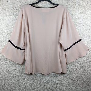 Pre-Owned Condition! 96% Polyester/4% Spandex. No Size Tag. Beautiful Contrast Trim Bell Sleeve Pullover Blouse, Pink with Black Trim. Measurements are Accurate for a 1XL, Plus Size.