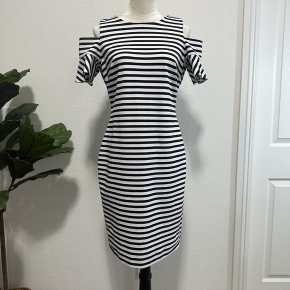 Calvin Klein Women's Stripe Cold Shoulder Sheath Dress Stretch Size 10 Black White EUC - Office, Wedding, Party, Packable