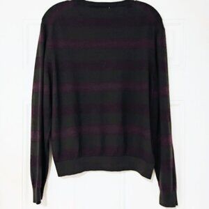 Luxurious Calvin Klein 100% merino wool crew neck sweater in olive / gray & eggplant stripes — timeless, soft, and perfect for work or fall layering