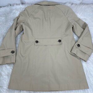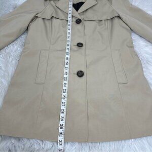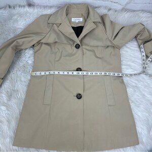 Calvin Klein women's tan size small, it is a winter trench coat, three button closure, collared, front hand warmer pockets, removable faux fur winter lining, inner coat lined, long sleeves, hip length, accent back buttons, extra buttons still attached, waterproof and wind resistant. Materials Shell 100% polyester, Coat inner lining 100% polyester, Removable lining body 51% acrylic, 49% polyester, Sleeve 75% polyester, 25% cotton. Care machine wash cold line dry. Condition is very good with one small faint stain under the third button as shown in pictures. Please preview measurements to ensure fit.