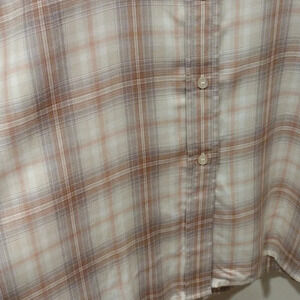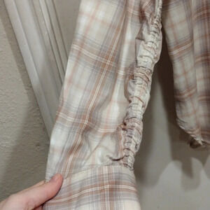 Calvin Klein Women's Tan Plaid Longline Button Down Shirt. This has ruching in the inner sleeves. This is in like-new condition. It is a blend of Tencel Lyocell and Viscose. It is super comfy fabric. Size L.