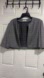 Sophisticated gray blazer with textured design. Open front style. Ideal for professional settings.