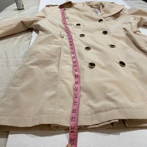 Timeless Calvin Klein double-breasted trench coat in a classic beige/tan color. Features a removable waist belt, button front, shoulder details, adjustable cuff straps, and a silky satin lining. Perfect for workwear, travel, spring/fall weather, or elevating any outfit with a polished look.