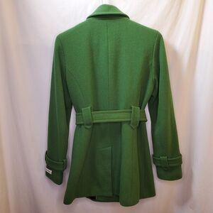 Chic and cozy peacoat by Calvin Klein. Features a vibrant green hue. Double-breasted with a stylish belt.