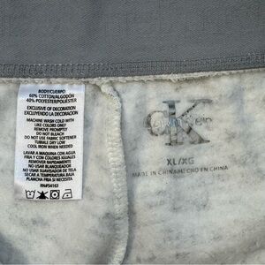 Cozy Calvin Klein cropped joggers with soft fleece lining. Comfortable wide elastic waistband with tie closure. Heather gray and features silver logo detail on the left leg. Stylish but comfy, perfect for fall outings and coffee runs!