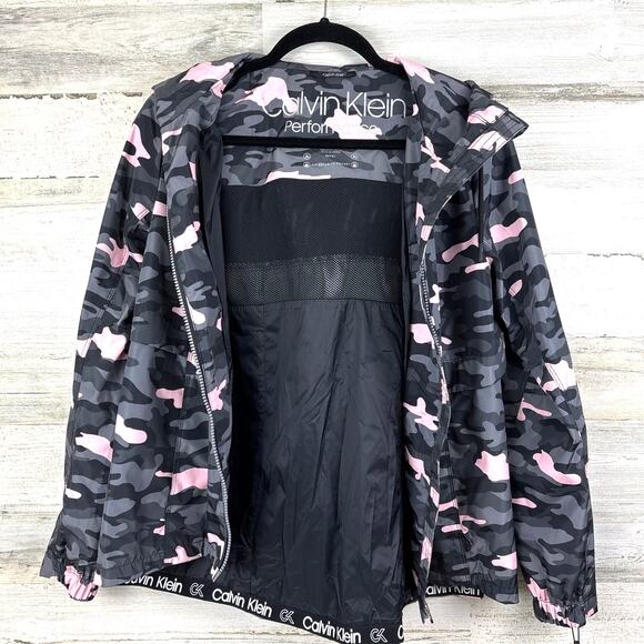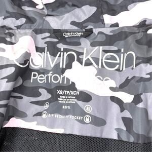 Calvin Klein performance jacket, women’s XS hooded coat, pink camo jacket, Calvin Klein activewear, lightweight hooded coat, women’s athletic jacket, camo zip front jacket, casual sporty coat women’s, Calvin Klein outerwear