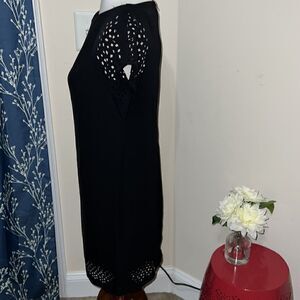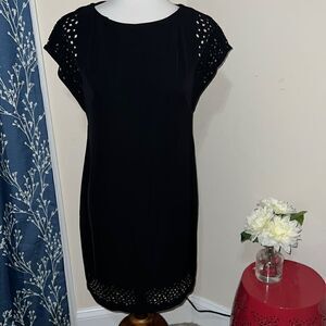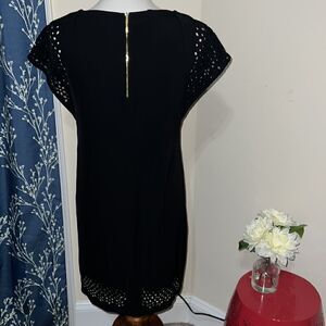 Good, preloved condition. Calvin Klein Women's Laser Cut Short Sleeve Sheath Dress. Black. Gold zip exposed.
