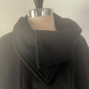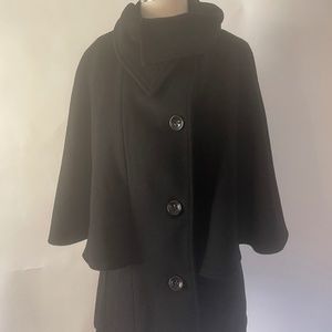 Black wool pea coat with cape sleeves and cape back. Underneath the cape the coat is sleeveless and might not appear like it would be warm enough but it is for chilly weather in milder climates! You can wear it with or without the belt which is not attached to the coat. The collar can also be worn open or buttoned up. Love it but it no longer fits. Perfect for dressier occasions. Very gently used and only worn a couple of times.