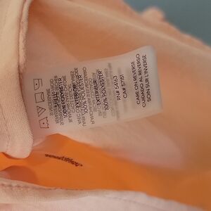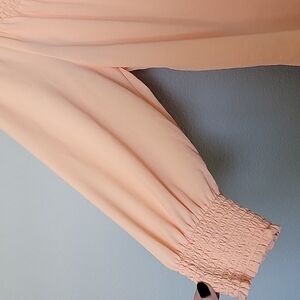 Smocked around the chest and at the end of the sleeves. Lightweight crinkle texture fabric, doesn't stretch. A light peach color. Ties at the neck and has metal embellishments at the end of the strings. 3/4 sleeves. Might be minimally sheer, you can see my black hanger through it. Office, workplace, vibrant, colorful, pastel, church, brunch, career, feminine, girly, dopamine, classy, dressy, soft girl
