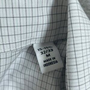 Classic white dress shirt with grid print, wrinkle-free fabric, and stretch fit. Regular fit style, size M, made with cotton blend for comfort and durability.