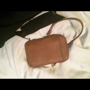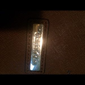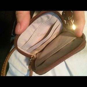 Inside there is one big pocket and 3 smaller pockets on other side, one big pocket on back of the wristlet also. Its real leather. It's in perfect condition I got it as a gift and just don't wear leather.