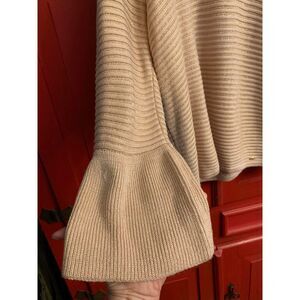 This is GORGEOUS and has no signs of wear. It is a pretty peach color which doesn't show up that well in photos. It has a good shimmer between the rubs (if that makes sense?) Cowl neck and cool sleeves. The bust when laid flat pit to pit is 23" across. The sleeves are approx 26" and the total length is approx 30"---------------------------36