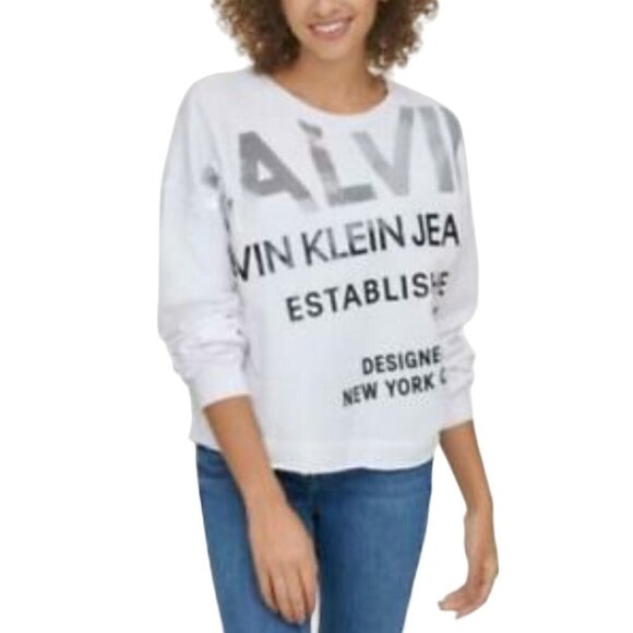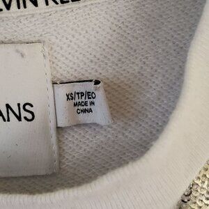 Calvin Klein Y2K Sequin SpellOut Raw Hem Long Sleeve Crop Top, Size XS. White, Silver Sequin, Good Pre-Owned Condition. Small hole on shoulder as pictured. Relaxed Fit