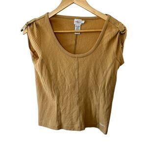 Calvin Klein Y2K Tan Cap Sleeve Ribbed Scoop Neck Top Sz Large Buckle Sleeves