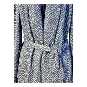 This Calvin Klein jacket features a chic black and gray zebra print design, blending bold style with comfort. Made from a soft fabric blend of 85% polyester, 14% rayon, and 1% spandex, the jacket offers slight stretch and durability. It has a relaxed, open-front style complemented by a removable tie belt for adjustable fit and added shape. The long sleeves and structured lapel create a sophisticated yet versatile look, perfect for layering over casual or dressy outfits. The back hem has a flowy, slightly flared design for added movement and style. This statement piece is ideal for adding texture and pattern to your wardrobe while staying effortlessly stylish.