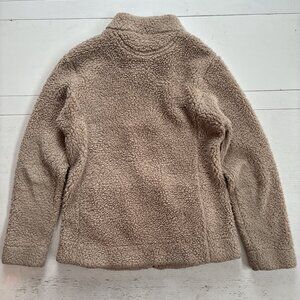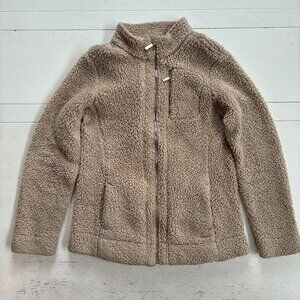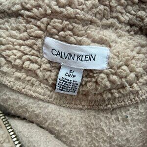 Light brown Calvin Klein zip-up jacket, fleece-like with a “sheep” texture. One front zippered chest pocket. Fair condition, cozy and warm.