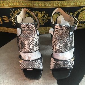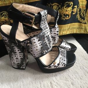 Cute, on trend Calvin Klein Vallin white and black cut out sandals. Leather wrapped 4.25” chunky heel w/ 3/4” platform. In great used condition. Smoke free and pet free. 🔳🔲
